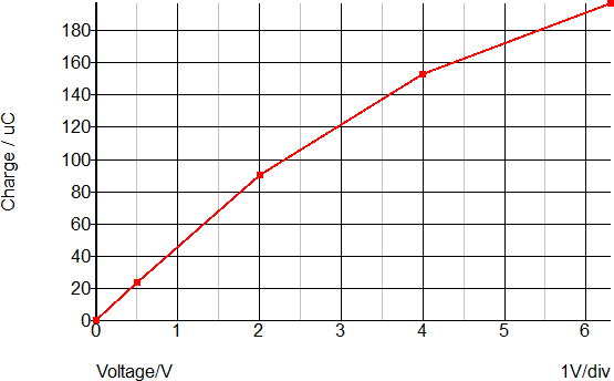 This schematic has the datasheet curve points stored in a script located in the schematic's F11 window. After pressing F9 to run the schematic, the data sheet curves for the capacitance and charge are automatically generated. The script also generates the percentage error between the datasheet charge and the PWL capacitor charge curves. The maximum charge error is approximately +2%/-1.7%. More PWL segments could be added to reduce this error, at the expense of longer simulation times. The capacitor in this example is a typical MLCC capacitor rated at 6.3V. The data sheet curve was digitized using the Tools ▶ Digitise Data Sheet Curve...