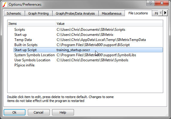 At this point, You should have the four scripts files from the zip archive in the Scripts directory, along with the startup.sxscr script. All that is left is to tell SIMetrix/SIMPLIS to execute one of the training scripts when the program starts.