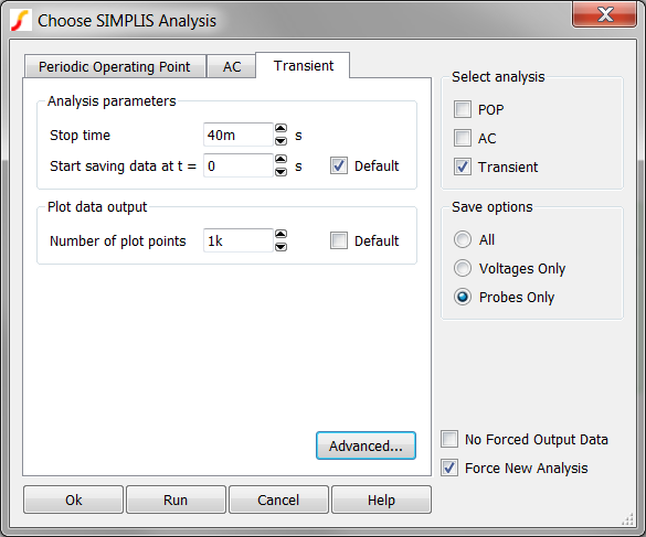 The first three exercises use an example circuit with a small RC time constant. Exactly the same effect is present in circuits with a small L/R times constants. This typically occurs in transformer isolated circuits with very small leakage inductances. This problem can be solved by adding a resistor parallel to the inductor. This shunt resistor limits the high frequency response of the inductor and thereby limits the minimum time constant. SIMPLIS has a built-in multi-level lossy inductor which includes a series resistance and a shunt resistance for these applications. In the next exercise, you will see how the multi-level lossy inductor values effect the minimum time constant and the elapsed simulation time.