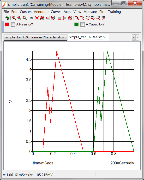 Result: The transient simulation executes and the waveforms for the resistor and capacitor voltages are shown. Clearly these voltages are not those of a resistor or a capacitor!