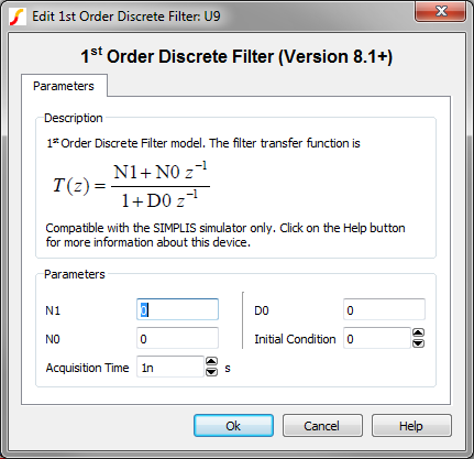 The information in this topic refers to the latest 1st Order Discrete Time Filter which was introduced in version 8.10. In versions prior to 8.10, a similar Discrete Time Filter exists and has the same behavior as the new version. The new version simulates slightly faster than the old version, but the electrical behavior is identical. If you require a discrete time filter for use in versions prior to 8.10, the old 1st Order Discrete Time Filter can be placed from the part selector location: .