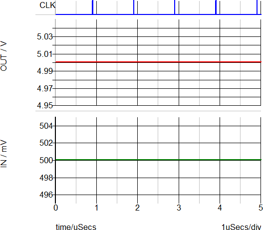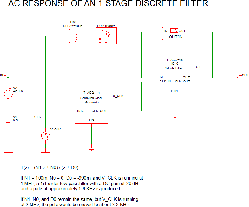 The POP waveforms below show that the DC input voltage to the filter is 0.5V and the DC output voltage is 5V, confirming that the DC gain of the 1st order discrete time filter is 10.