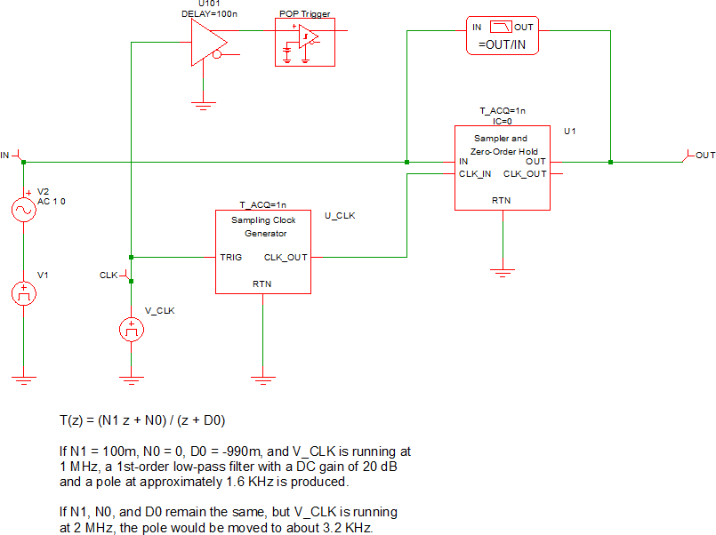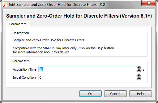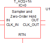 The information in this topic refers to the latest Sampler and Zero-Order Hold which was introduced in version 8.10. In versions prior to 8.10, a similar Sampler and Zero Order Hold exists and has the same behavior as the new version. The new version is implemented in a library file as opposed to a templatescript, but the electrical behavior is identical. If you require a sample/hold for use in versions prior to 8.10, the old Sampler and Zero-Order Hold can be placed from the part selector location: .
