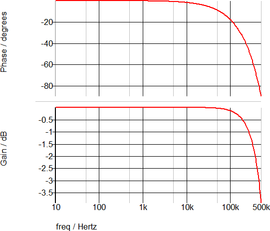 The following AC waveforms confirm that the DC gain is 0dB and the phase change at 1/2 the sampling frequency is the expected 90 degrees.