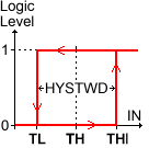 Hysteresis, Threshold Hysteresis and Threshold of the inputs. The hysteretic-window width, HYSTWD is centered around Threshold (TH) voltage. To determine the actual threshold ( TL , THI ), substitute Threshold (TH) and Hysteresis (HYSTWD) in each of the following formulas:
