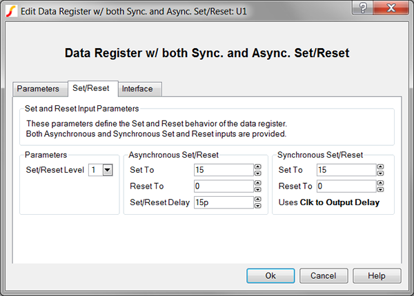 The Data Register with both Sync and Async Set/Reset models a clocked data register with a load (enable) input. The clock edge for the register can be set with the Trigger Condition parameter to be a rising edge (0_TO_1) or a falling edge (1_TO_0). Both asynchronous and synchronous set and reset inputs are provided. The active logic level of the inputs can be configured with the Set/Reset Level and Load Level parameters.