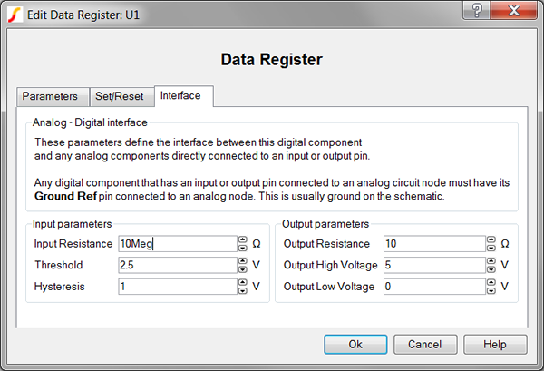 To define the parameters for the interface between this digital component and each analog component connected directly to an input or output pin, follow these steps: