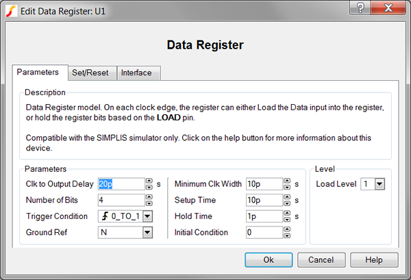 The Data Register models a clocked data register with a load (enable) input. The clock edge for the register can be set with the Trigger Condition parameter to be a rising edge (0_TO_1) or a falling edge (1_TO_0). The set/reset events can be configured to be asynchronous or synchronous to the clock with the Set/Reset Type parameter. The active logic levels of the inputs can be configured with the Set/Reset Level and Load Level parameters.