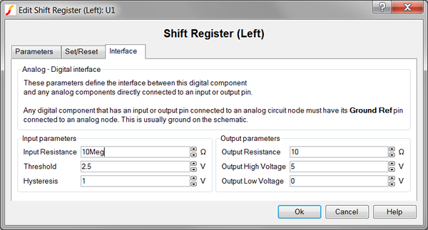 To define the parameters for the interface between this digital component and each analog component connected directly to an input or output pin, follow these steps: