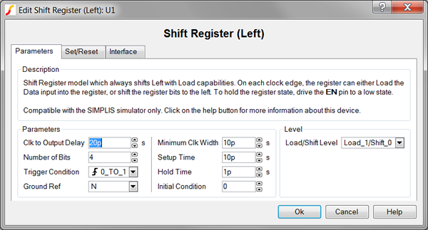 Because the Shift Register (Left) model is generated by a template script when the simulation is executed, a hand-coded model cannot be inserted into a netlist. The template script for this device is simplis_make_register_model.sxscr, which licensed users can download as part of a zip archive of all built-in scripts.
