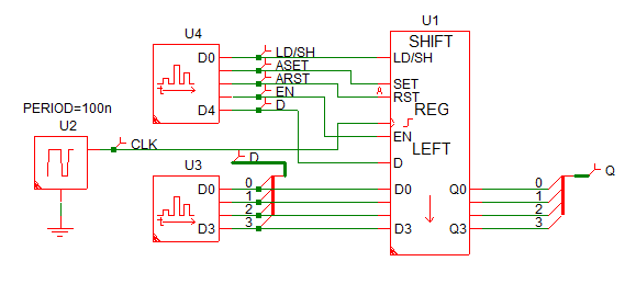 The image below shows the load and shift behavior when the D input is 0. During a Left shift operation, the D input is shifted into the LSB; since D=0, the new Q output is twice the old Q. The initial condition of the left shift register is set to 15 decimal in the example.