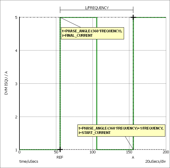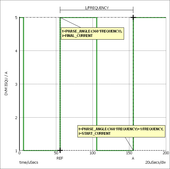 In this example the PHASE_ANGLE parameter is set to 190, and the OFF_UNTIL_DELAY is set to 1; therefore, for simulation times less than the time delay defined by the PHASE_ANGLE parameter, the load current is 1A, which is the value of the START_CURRENT argument.