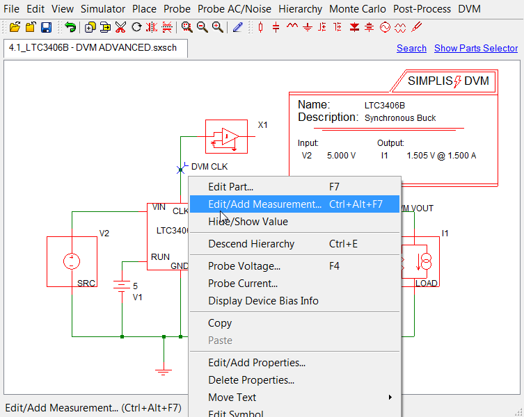 1. Open the schematic, 4.1_LTC3406B - DVM ADVANCED.sxsch in the LTC3406B/ directory you unzipped in 2.0 SIMPLIS DVM Tutorial - Getting Started.