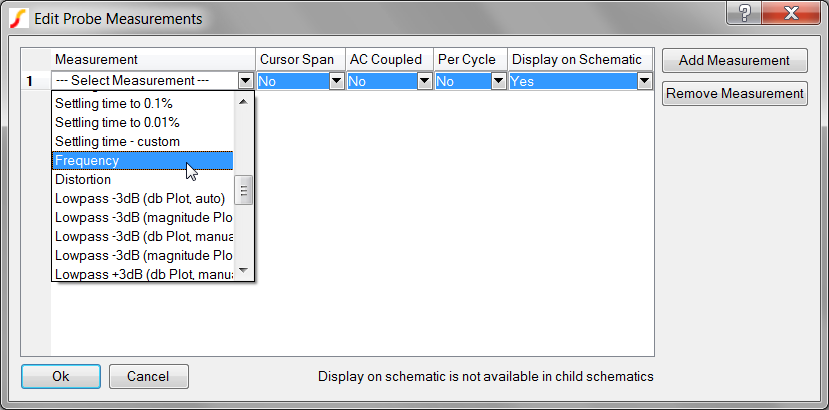 • The built-in SIMetrix/SIMPLIS measurement system is smart enough to know that the frequency measurement can be applied only to transient or POP data. Therefore, if you run an AC analysis, the frequency will be measured for the POP simulation, but not for the AC analysis.