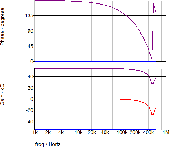 The AC transfer function for the adder is shown below. The DC gain is -54dB, ( BIN_SIZE ).