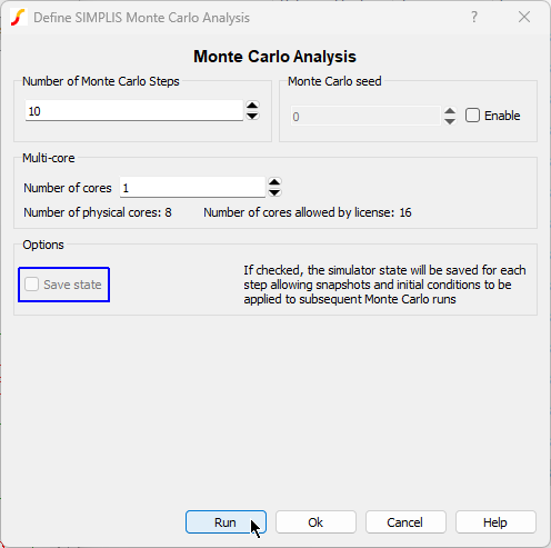 When running multi-step or Monte Carlo simulations, you can instruct SIMPLIS to create an initial conditions file for each step or seed value. You do this by checking the "Save state" checkbox on the Multi-Step or Monte Carlo dialog as shown below: