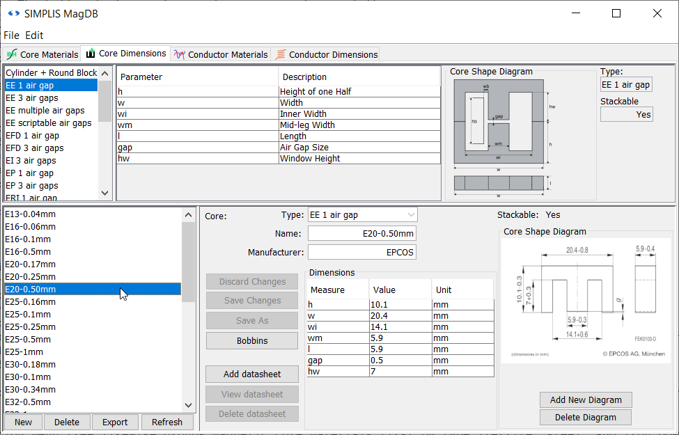 Click on the Core Dimensions tab of the MagDB window. In the top left corner there is a list of core shapes. These are the core shapes which are available for magnetic component models in MDM. You cannot edit, delete, or modify core shapes. New core shapes will be added as MDM is updated. However, you can edit the geometries available for each shape, which are listed in the bottom left list. To see all the available geometries for the EE 1 air gap shape: