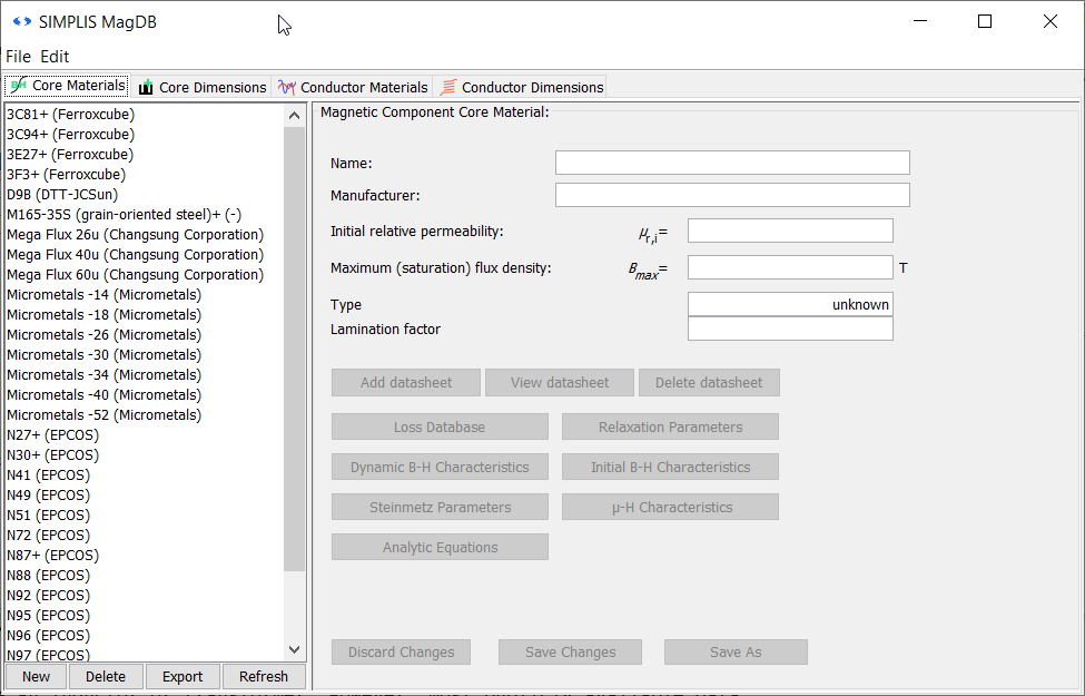 MagDB is opened by default to the first tab, Core Materials, where you can see a list of magnetic core materials available for making a model of a magnetic component using SIMPLIS MDM. The fields to the right are blank since no material is selected in the list to the left. Click on a material in the list to populate the fields with information about that material.