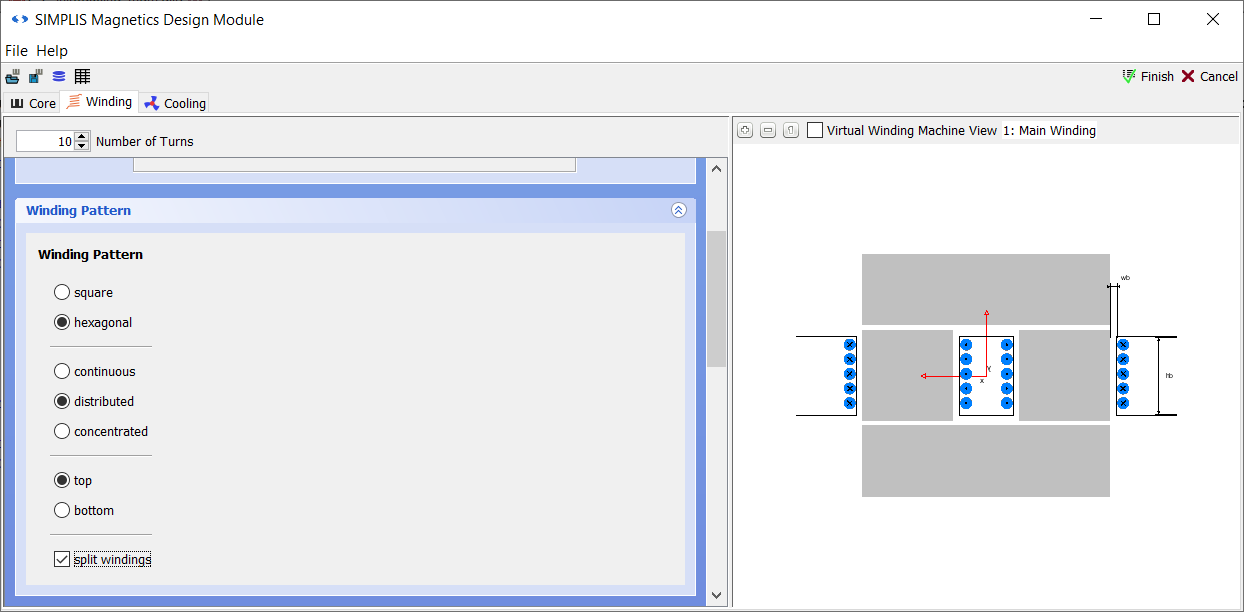 5. Since this is a two-legged core, you can split the winding across the two legs. Check the split windings box at the bottom of the Winding Pattern sub-panel.