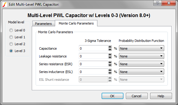 The Multi-Level PWL capacitor has four levels: 0, 1, 2, and 3. As the model level increases, so does the model complexity; and, as a rule, simulation times also increase.