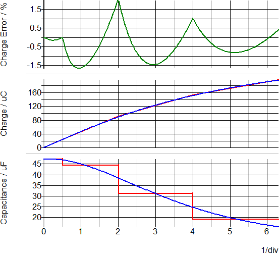 This schematic has the datasheet curve points stored in a script located in the schematic's F11 window. After pressing F9 to run the schematic, the data sheet curves for the capacitance and charge are automatically generated. The script also generates the percentage error between the datasheet charge and the PWL capacitor charge curves. The maximum charge error is approximately +2%/-1.7%. More PWL segments could be added to reduce this error, at the expense of longer simulation times. The capacitor in this example is a typical MLCC capacitor rated at 6.3V. The data sheet curve was digitized using the Tools ▶ Digitise Data Sheet Curve...