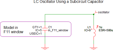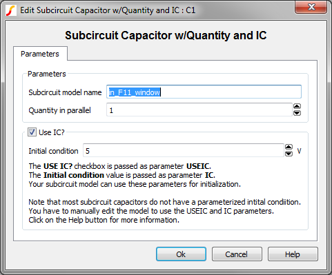 Most subcircuit capacitor models do not implement initialization of the reactive components in the model, and therefore the two passed parameters will be ignored. You must hand edit the model to use the USEIC and IC parameters. The F11 window of the following example describes the syntax. For more details on parameterization, see the 5.4 Exploiting the Netlist Preprocessor topic.