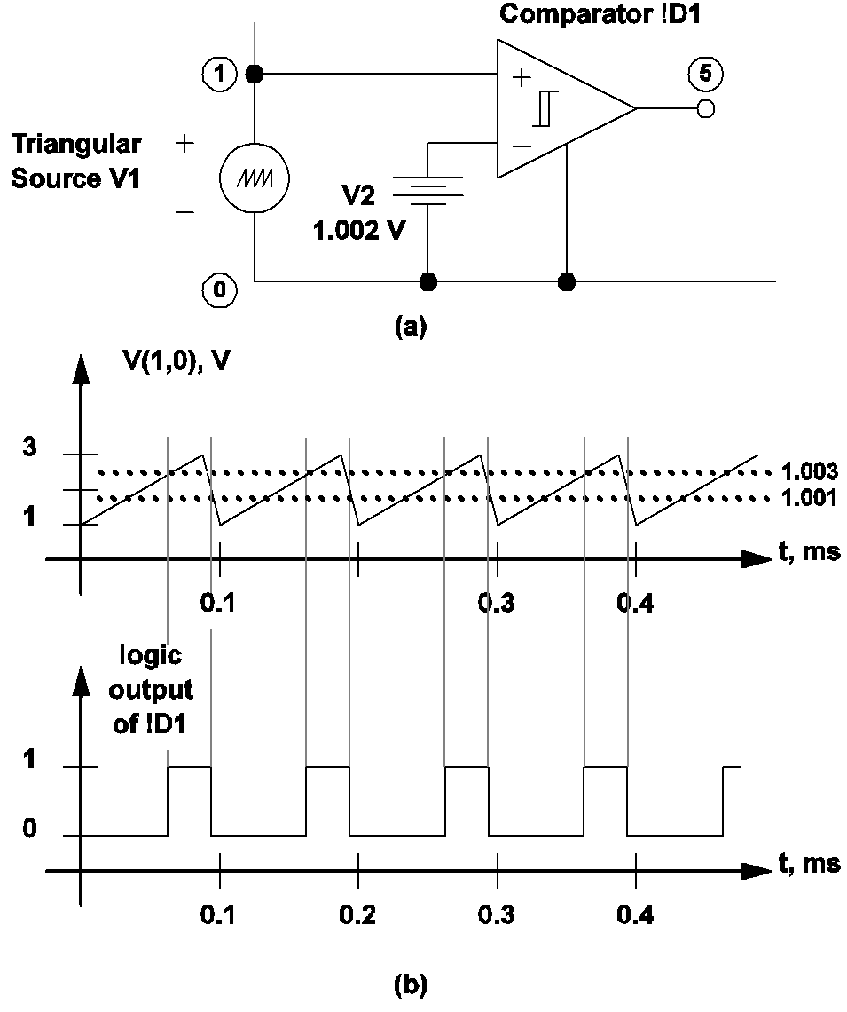 The model statement states that the output of the comparator is equal to logic 1 whenever the voltage at the non-inverting input is 1 mV above that of the inverting input, and that the output is equal to logic 0 whenever the voltage at the non-inverting input is 1 mv below that of the inverting input. Since the voltage at the inverting input of !D1 is a DC voltage source of 1.002 V, this implies that the output of !D1 is equal to logic 1 when the voltage of V1 exceeds 1.003 V, and it is equal to logic 0 when the voltage of V1 drops below 1.001 V. When the voltage of V1 is between 1.001 V and 1.003 V, the output state of !D1 remains unchanged. The diagram in fig 10.1(b) illustrates the relationship between the output state of !D1 and the voltage of source V1. The figure shows that the output of !D1 will have a logic 1 to logic 0 transition whenever the voltage of V1 is decreasing and equal to 1.001 V.