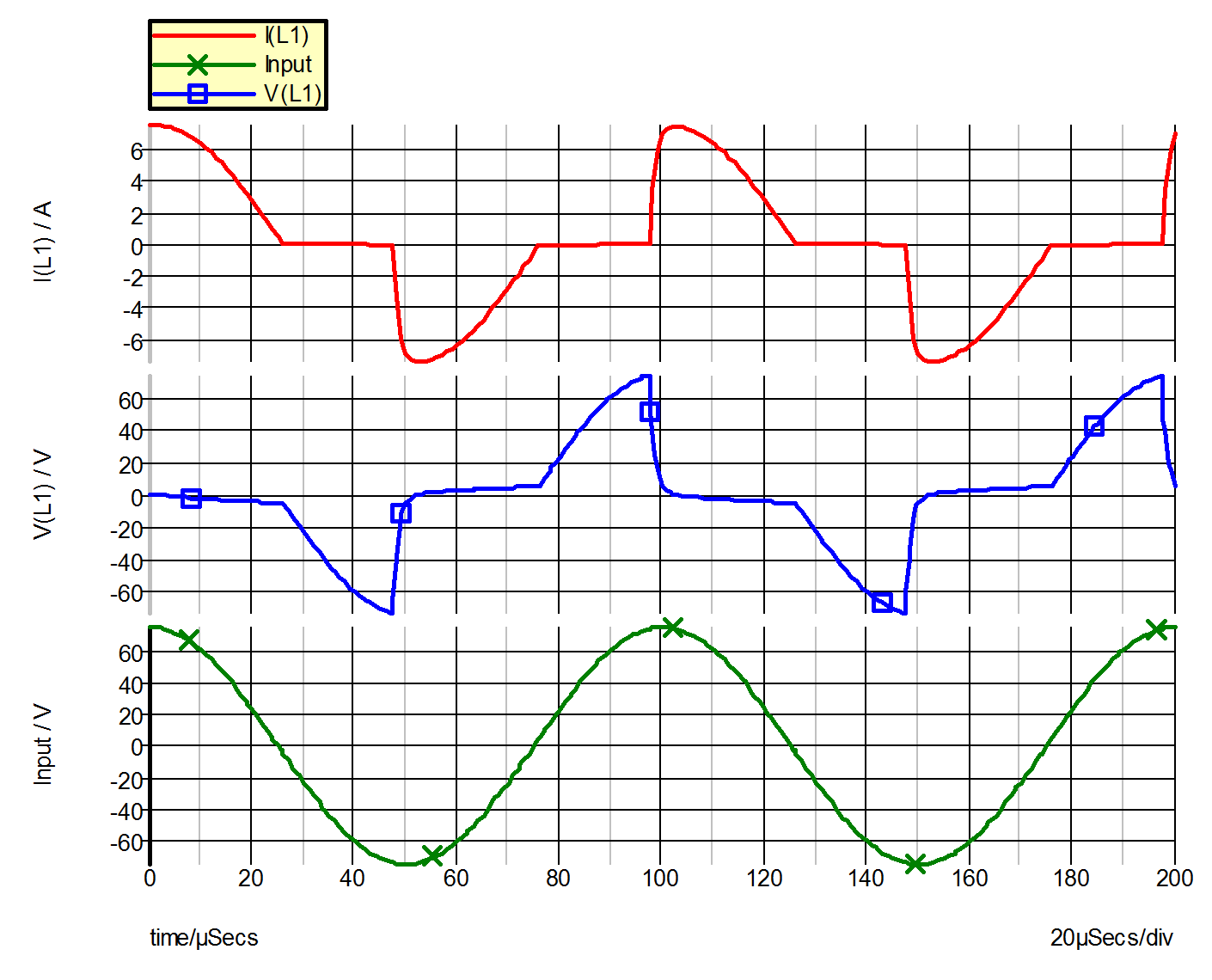 The saturable inductor is modeled by the piecewise-linear inductor L1 (!L$L1 in the input file), with the flux linkage entered in units of weber-turns. The variables of interest are the input voltage V(VI), plus the voltage V(L1) and the current I(L1) of the PWL inductor. The simulated waveforms for these variables are shown in fig 9.19.
