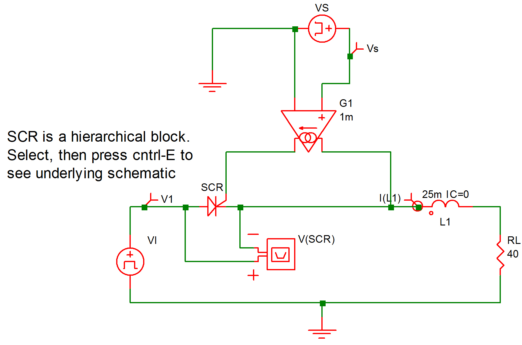 The variables of interest are the input voltage V(VI), the signal voltage V(VS), the current I(L1) through the inductor, and the voltage V(SCR) across the SCR. A differential voltage probe has been added to plot the latter. The waveforms associated with these variables as obtained from the simulation are shown in fig. 9.23.