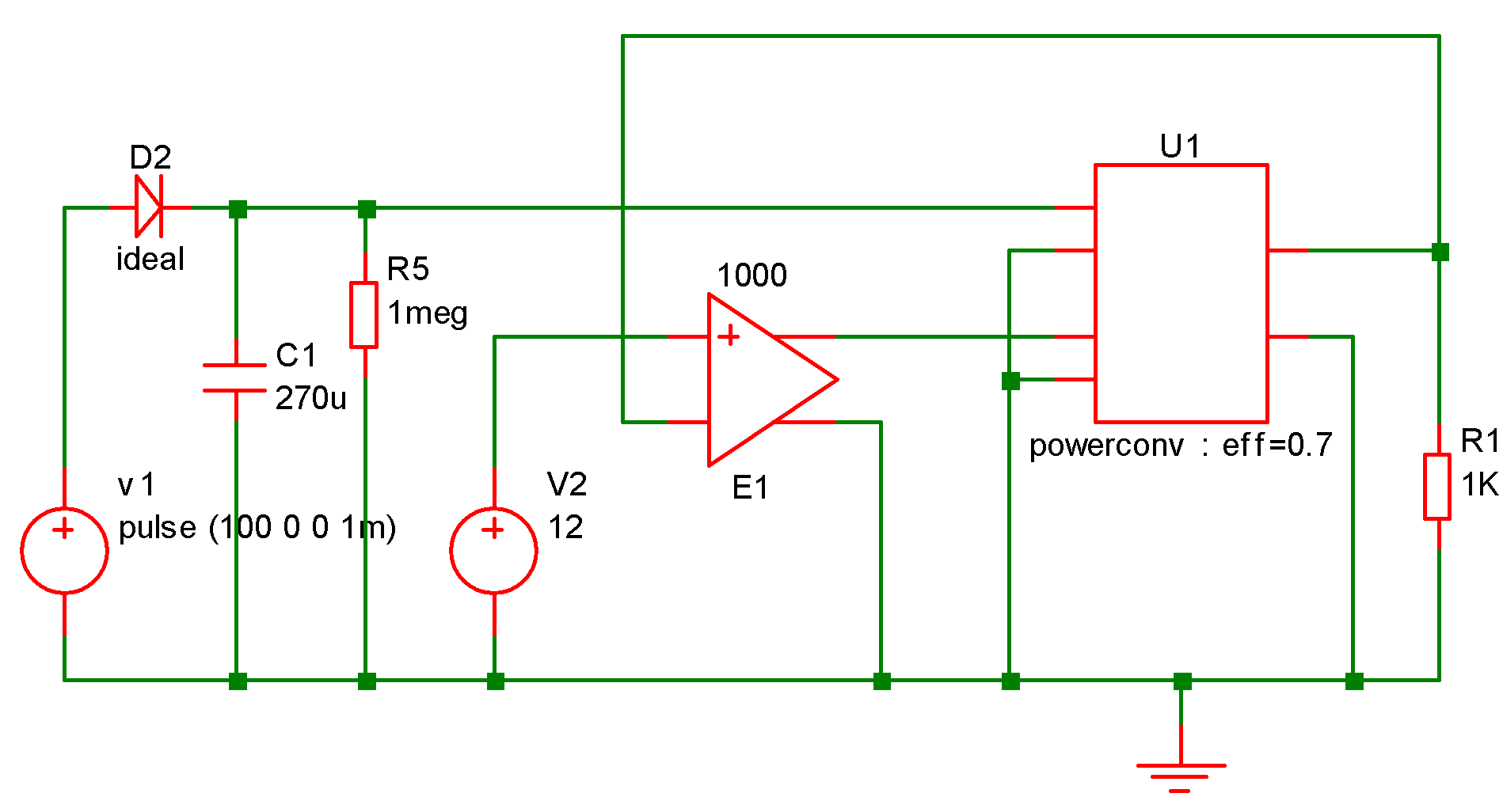 The following subcircuit implements an idealised power converter with an efficiency of eff and whose output voltage is proportional to the input voltage (vinn,vinp) multiplied by the control voltage (vcp,vcn). It is intended to simulate the voltage/current characteristics of a switching power converter.
