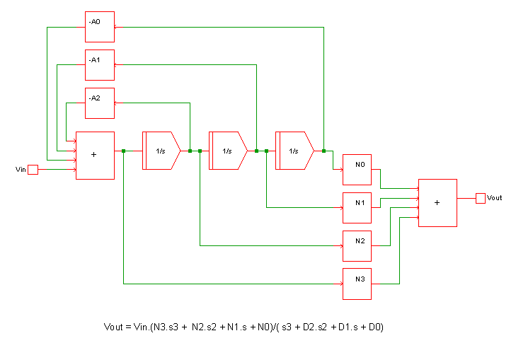 This device implements a Laplace transform using a network of integrators. The diagram below shows the configuration used for a third order network.