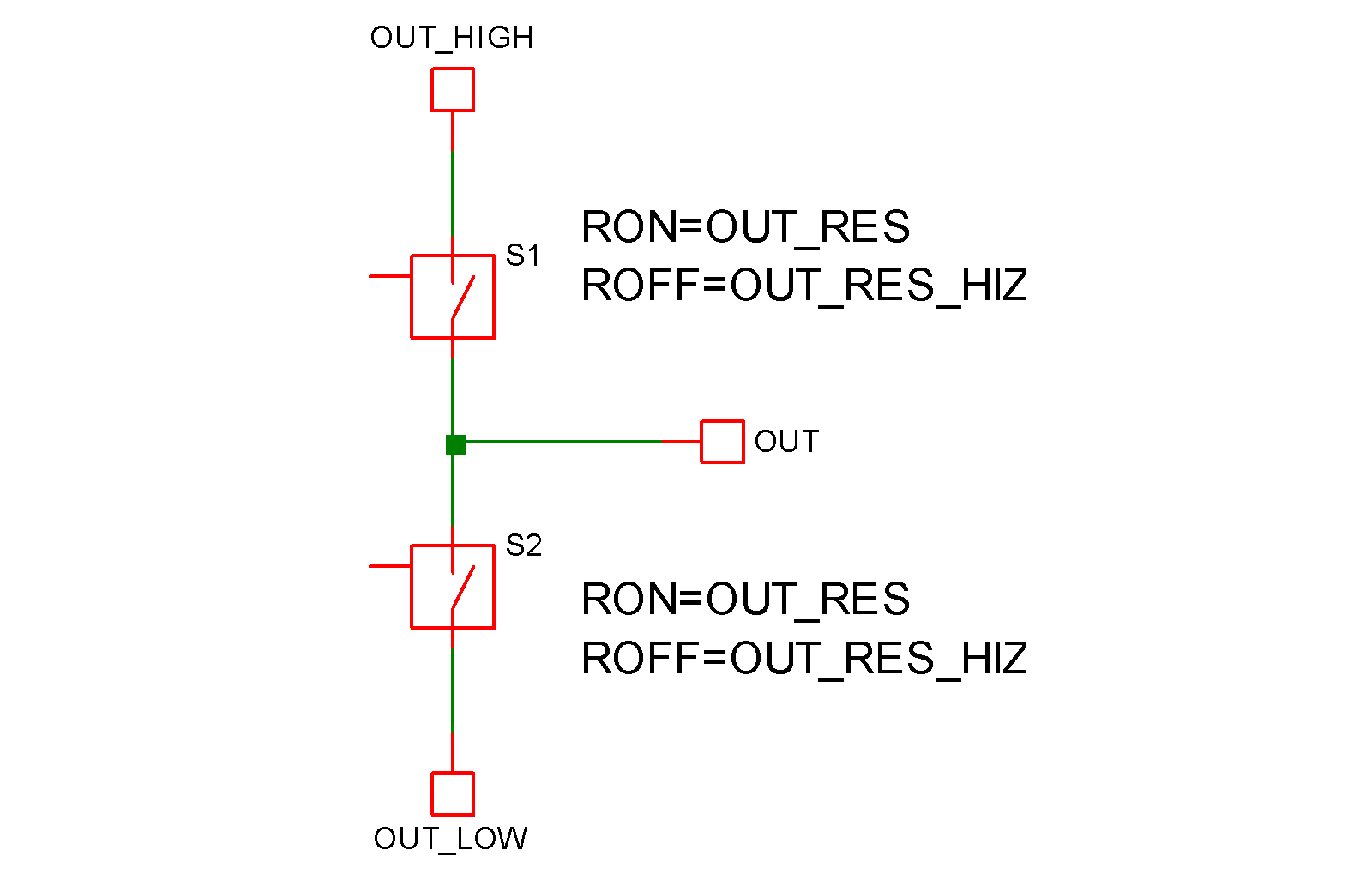 Each switch has an on state resistance of OUT_RES and an off state resistance of OUT_RES_HIZ. In the logic one state, S1 is on, in the logic zero state S2 on, while in the high-impedance state, neither switch is on. When transitioning from one state to another state, each switch's resistance changes linearly to the new state's value in the time determined by the parameters T_RISE and T_FALL.