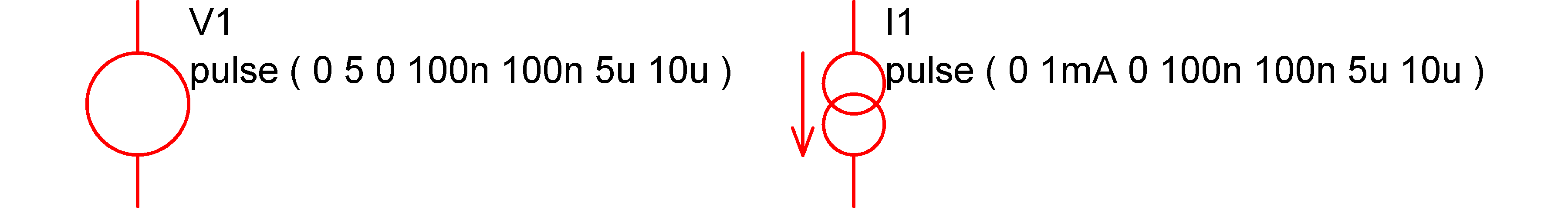 Both the above examples give a pulse lasting 5???MATH???\mu???MATH???S with a period of 10???MATH???\mu???MATH???S, rise and fall times of 100nS and a delay of 0. The voltage source has a 0V base line and a pulse of 5V while the current source has a 0mA base line and a pulse of 1mA.