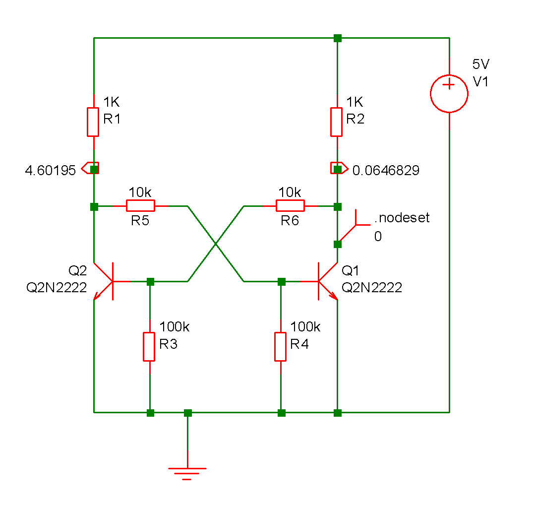 Nodesets can be used to force a particular solution for circuits that have more than one stable state. Consider the following circuit: