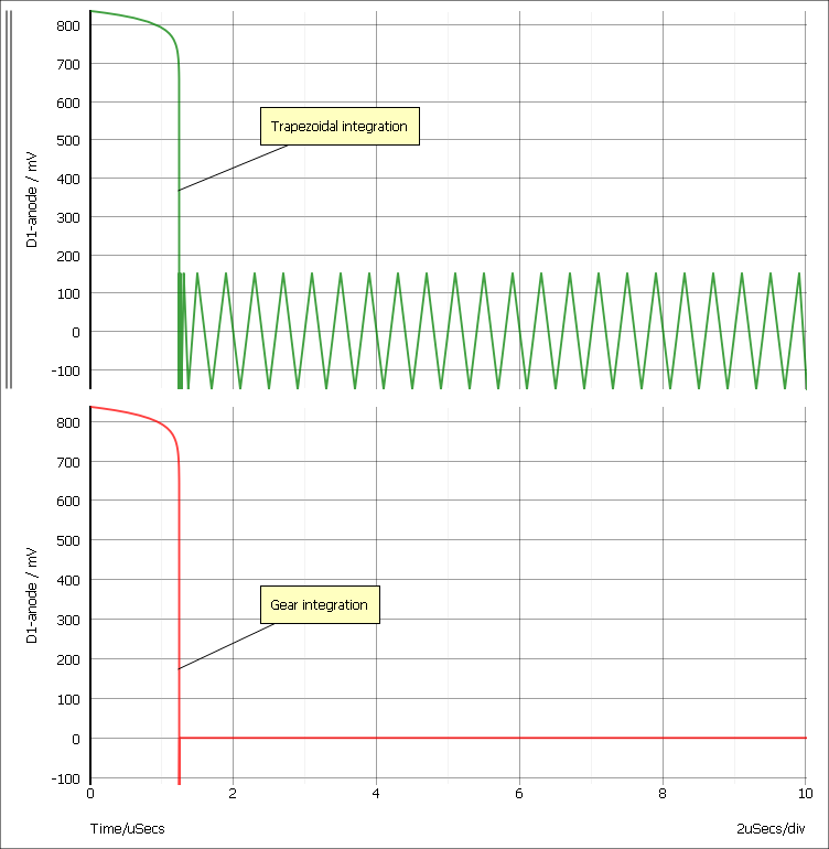 The plots show the reverse recovery of a diode. The green curve was simulated with the default trapezoidal integration method whereas the red used Gear integration. Note that gear integration introduces a slight overshoot. This is a common characteristic. To find out whether such overshoots are a consequence of the integration or are in fact a real circuit characteristic, you should simulate the circuit with much smaller values of RELTOL (see above). It is also suggested that you switch back to trapezoid integration when using tight tolerances; the oscillation caused by trapezoidal integration disappear if the time step falls below half the time constant of the circuit.