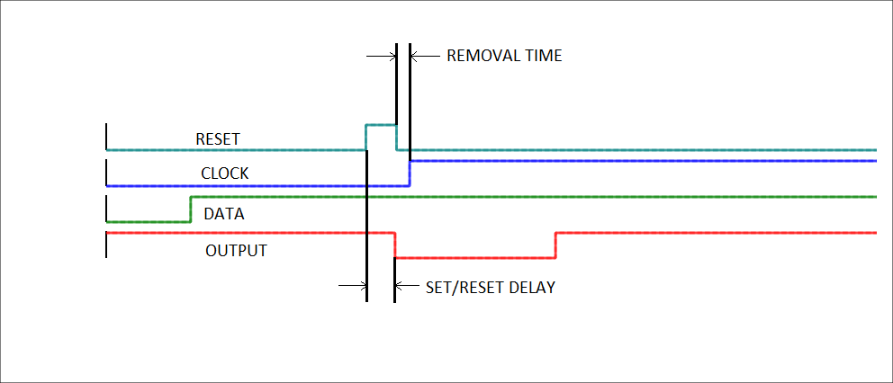 The diagram above illustrates the aynchronous set/reset timing and its interaction with clock timing. The set and reset signals must be inactive prior to the clock edge, the margin allowed being the removal time (rem_time parameter). If this condition is violated, the subsequent clock edge will be inactive but the set/reset will be successful as long as the minimum pulse width condition is satisfied.