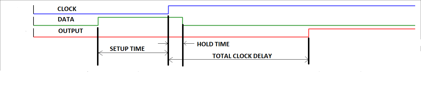 The diagram above illustrates setup time, hold time and total clock delay. The data input must not change between the setup time before the clock edge to the hold time after the clock edge in order for the data value to be clocked. If this condition is violated the flip-flop will not change state.