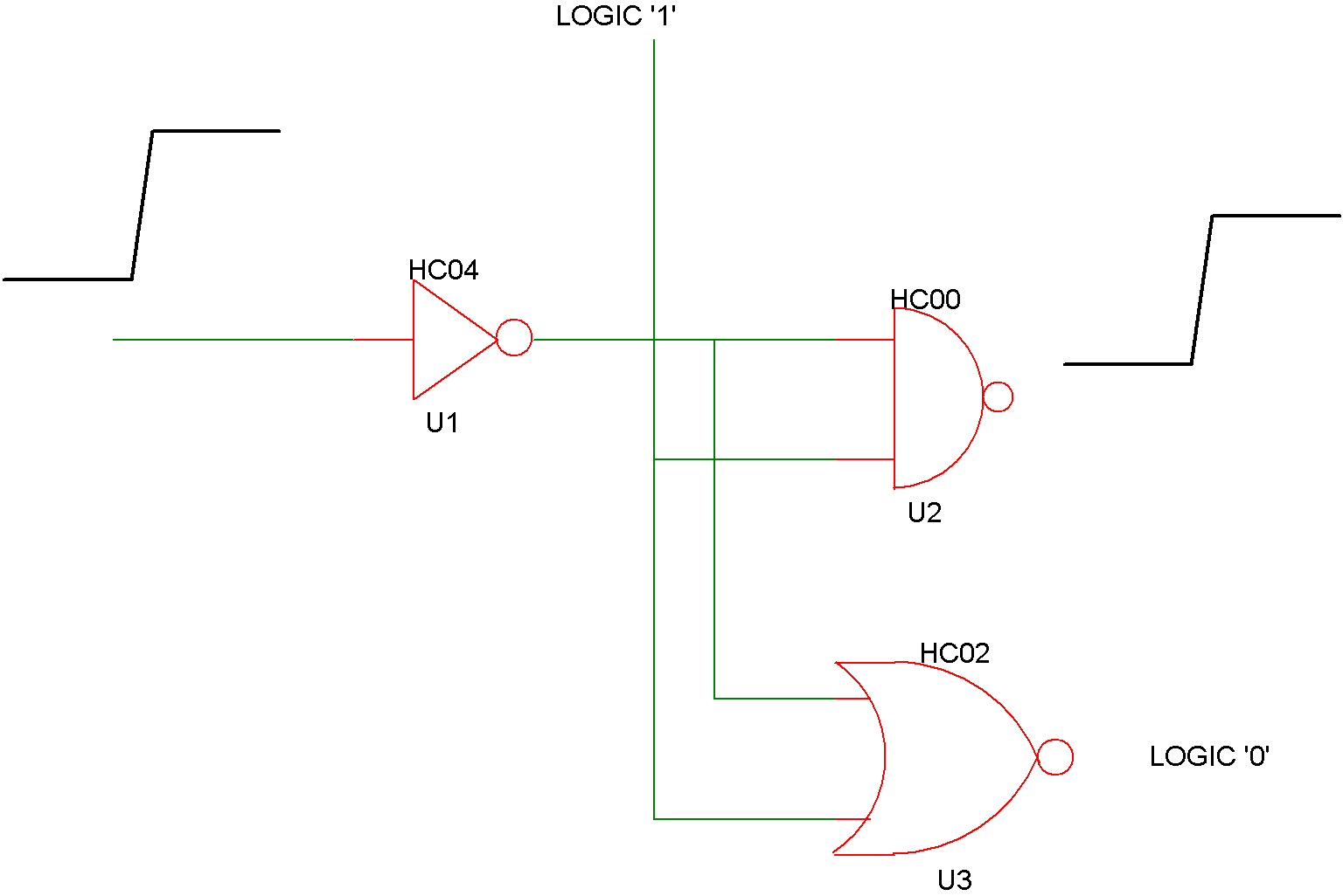 Connections between the analog and digital system are made via special interfaces bridges. (As described in Analog to Digital Interfaces these bridges are implicitly included by the simulator and it isn't necessary for the user to wire them in.) The digital to analog interface has an output that looks like - to a first approximation - an analog representation of a digital gate. This output changes voltage at a specified rise and fall time when the digital input changes state. More importantly, the analog system is notified when an event occurs at the input to a D-A interface bridge and a timestep is forced at that time. This is known as a breakpoint and is the analog equivalent of an event. The analog system is only notified of events that occur at the input of D-A bridges. It knows nothing of events that are internal to the digital system.