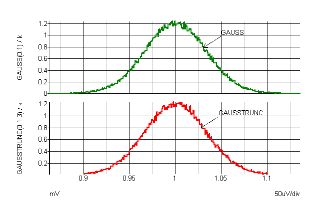 The standard Gaussian distribution functions (GAUSS(), GAUSSL()) return a random variable with a true Gaussian distribution where the tolerance value represents the 3???MATH???\sigma???MATH??? spread. This can return values that are outside the tolerance specification albeit with low probability. For example GAUSS(0.1) can return values >1.1 and less than 0.9 as defined by the Gaussian distribution. For specifying actual components this is not usually exactly correct as most components are tested at production and devices outside the specified tolerance will be rejected.
