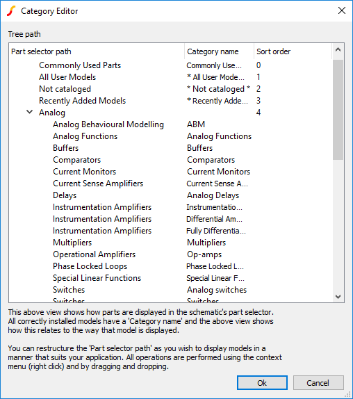 All parts listed in the part selector are assigned category names. The category editor maps these category names to positions in the part selector hierarchy. For example, the category name NMOS maps to the location Discretes ???MATH???\rightarrow???MATH??? MOSFETs - N-channel. So by using the category editor, it is possible to reorganise how parts are displayed. You can also remove categories from the part selector by moving them to the path called ** HIDDEN **.