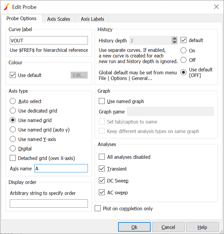 | Graph | Check Use Separate Graph to create a new graph sheet for the probe. You may also supply a graph name, in which case other probes using the same name will be directed to the same graph. The graph name may also be used to force curves to the same graph when the default action would be to create a new graph. This will happen for example for a new analysis type. The results from a Transient analysis, would usually be placed on a different graph sheet to the results from an AC analysis. Specifying this option with a name will override this. Check the Set tab/caption to name box to show the graph name in the caption bar and tab of the associated graph sheet. | ||||||||||||||