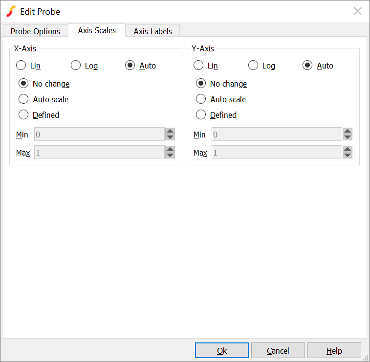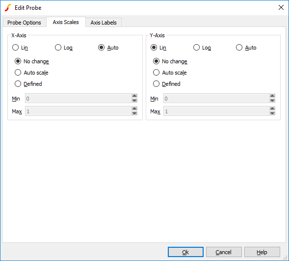 All probe types have a large number of options allowing you to customise how you want the graph plotted. For many applications the default settings are satisfactory. In this section, the full details of available probe options are described. Select the probe and press F7 or menu Edit Part...