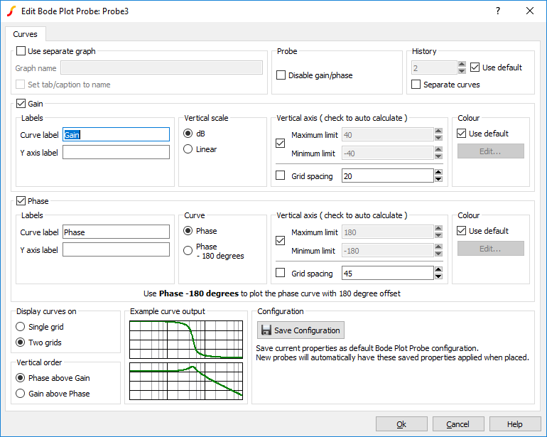 | Graph name | Curves with the same graph name property will be output on the same graph tab. Graph name be safely ignored unless multiple Bode plot probes are used. Use separate graph must be checked to supply this name. The name entered will be used as a label for the tab and the caption bar if the Set tab/caption to name box is checked |