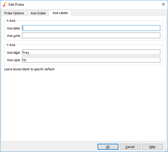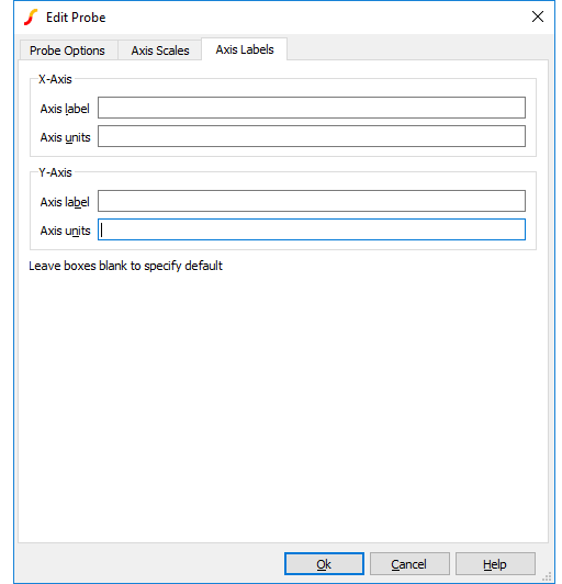 This sheet has four edit boxes allowing you to specify, x and y axis labels as well as their units. If any box is left blank, a default value will be used or will remain unchanged if the axis already has a defined label.