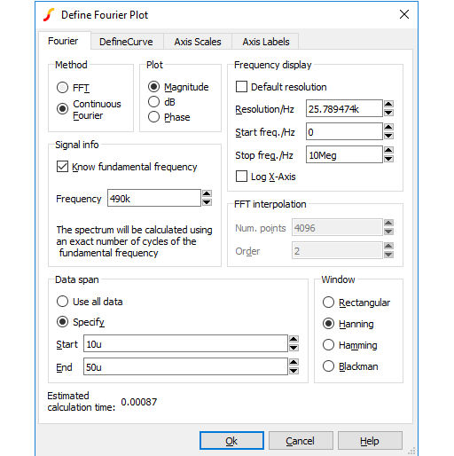 | Resolution/Hz | Available only for the continuous Fourier method. This is the frequency interval at which the spectral components are evaluated. It cannot be less than 1/T where T is the time interval over which the spectrum is calculated. |
