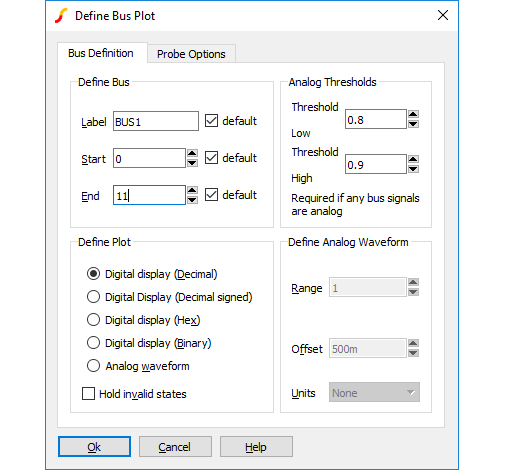 It is possible to probe a bus in which case a plot representing all the signals on the bus will be created. Usually this will be a numeric display of the digital bus data, but it is also possible to display the data as an analog waveform. Buses may contain either digital or analog signals; if any analog signals are present then threshold values must be supplied to define the logic levels of the analog signals.