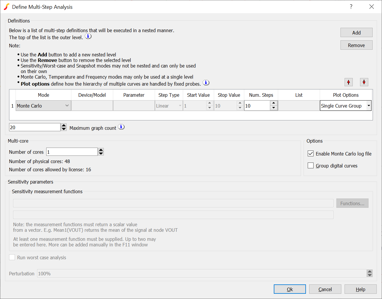 As with Monte Carlo, there are both Multi-step and single-step variants of sensitivity and worst-case analyses. Single-step can be applied to AC, DC, Noise and transfer function analyses; multi-step can be applied to the same analyses in addition to transient analysis.