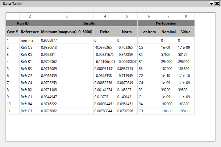 To resolve this we can tighten the specification of some components and to do this we first examine the sensitivity report. The report details the results of evaluating the sensitivity measurement functions along with the component values used.