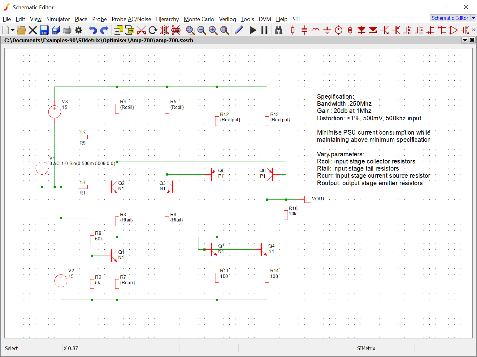 Before running the optimiser, open the associated schematic. Simply click the Open... button located at the top left of the optimiser GUI. The schematic is shown below: