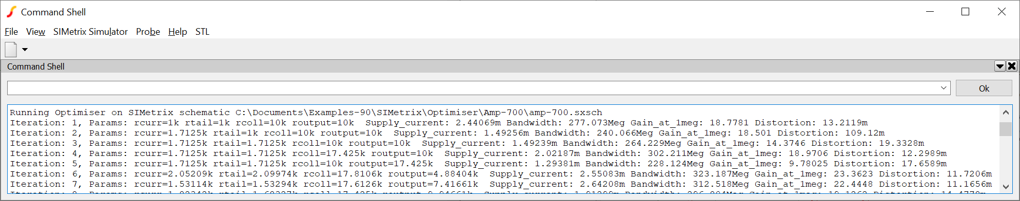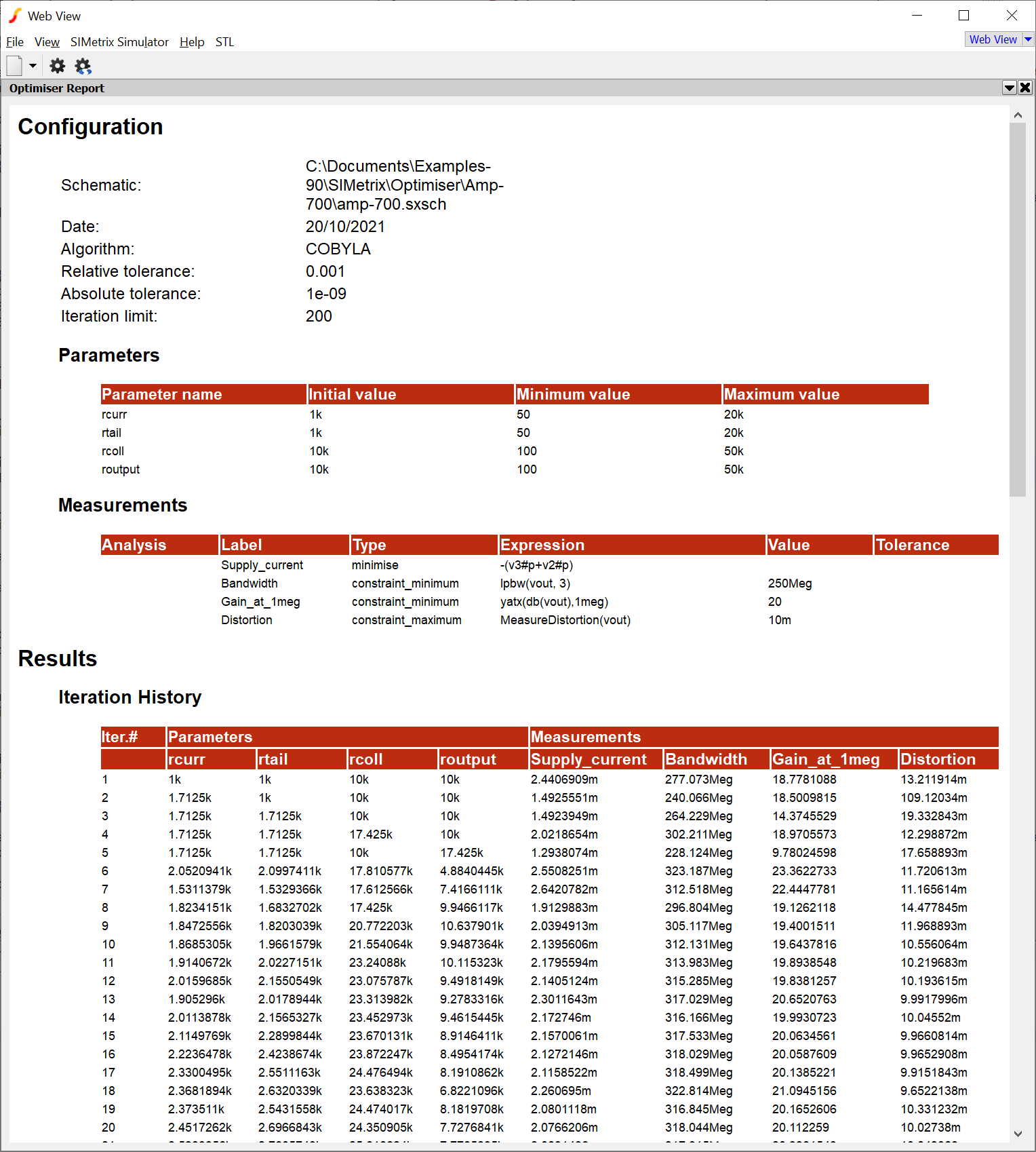 In summary, the first run using initial parameter values failed to comply with 2 out of 3 specifications while using 2.44mA supply current. In the final iteration, all specs were met and the supply current had been reduced to 1.74mA a 30% saving.